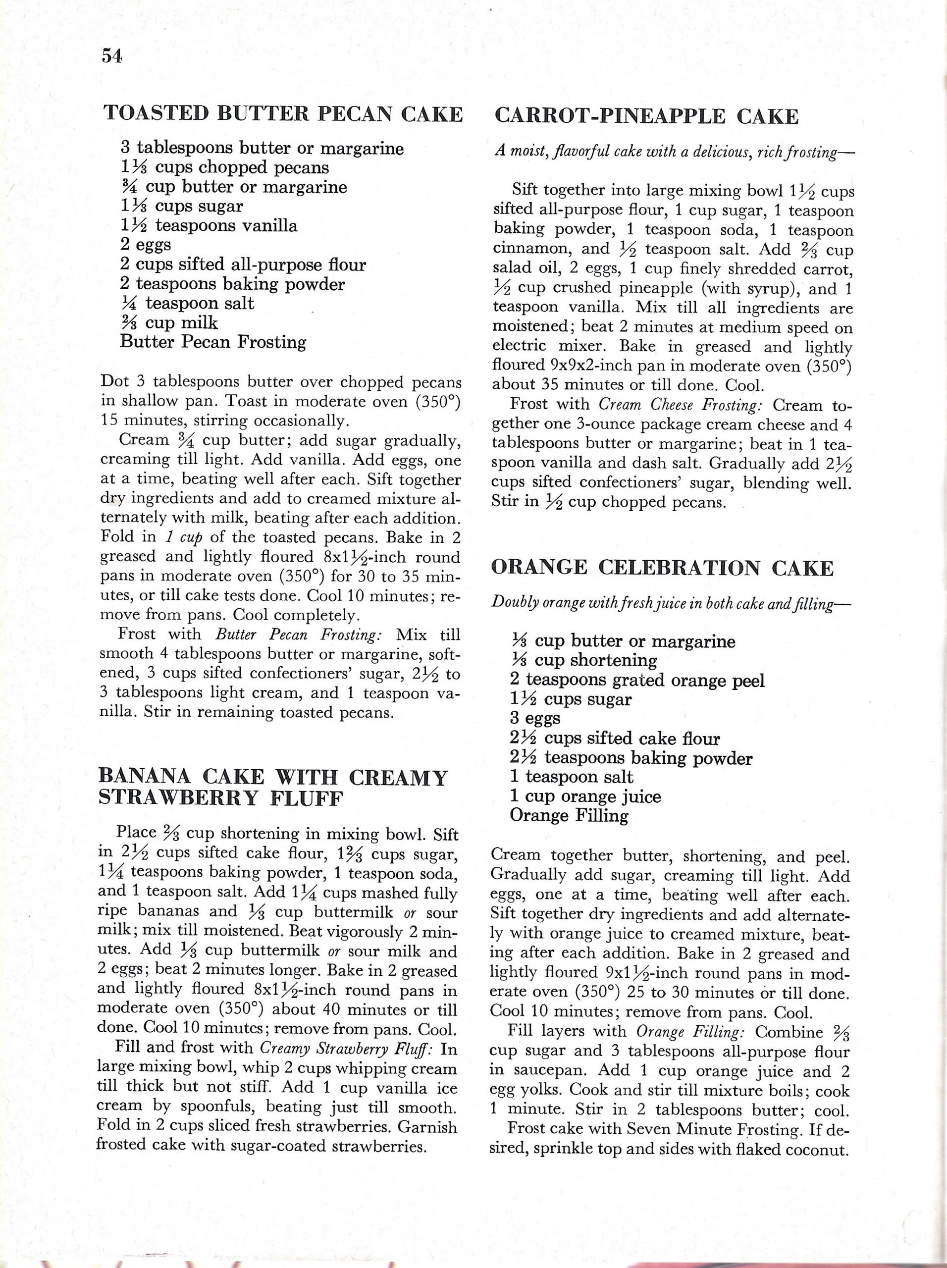 Better Homes & Gardens Pies and Cakes (1966), cookbook published by Meredith Press, was created to teach home cooks how to make simple pies and cakes. The vintage cookbook covers a very wide range of recipes from fruit pies and chiffon pies, to simple butter cakes and intricate layer cakes. In true Better Homes & Gardens style, the recipes are simple to follow and often times include pictures. Here is an original recipe for Carrot-Pineapple Cake, which I’ve also included my modern remake.