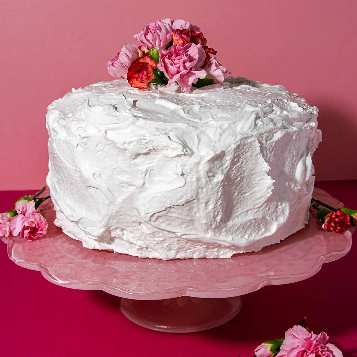 - Frost white with the 7-minute frosting and garnish with flowers in center.