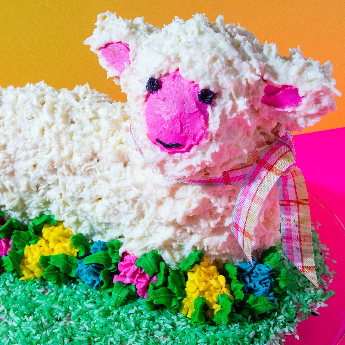 - Place green coconut flakes around the cake plate. Pipe swirl drop flowers (yellow, pink, blue) in tip #224 and leaves (green) using a leaf tip #67 around the base of the lamb. Tie a ribbon around neck of lamb.